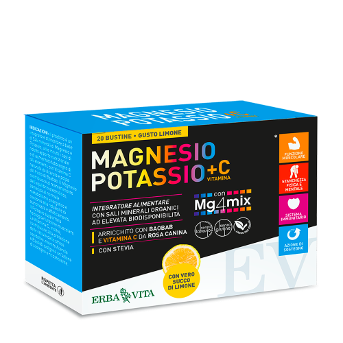 Prodotto realizzato con Mg4Mix, speciale complesso di quattro diverse fonti di Sali di Magnesio a elevata biodisponibilità e K2Complex, una miscela di Sali di Potassio. La formula è completata da polpa di frutto di Baobab e l’estratto di Rosa Canina, fonte naturale di Vitamica C.