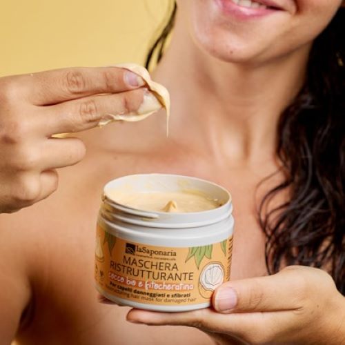 La nostra linea capelli è attenta anche alla salute del pianeta! Per questo motivo abbiamo deciso di utilizzare pack green e sostenibili. La confezione della Maschera ristrutturante per capelli secchi è in plastica riciclata.