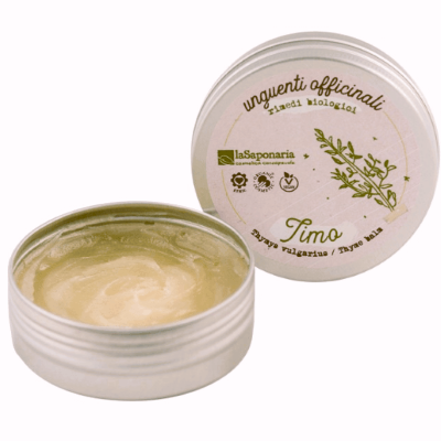 Questo unguento è fatto a mano, con tanti ingredienti biologici e vegetali ed è un vero concentrato di naturale freschezza. Contiene tutte le virtù del Timo bianco utilizzato in sinergia con puri oli essenziali di Eucalipto, Pino e Menta.