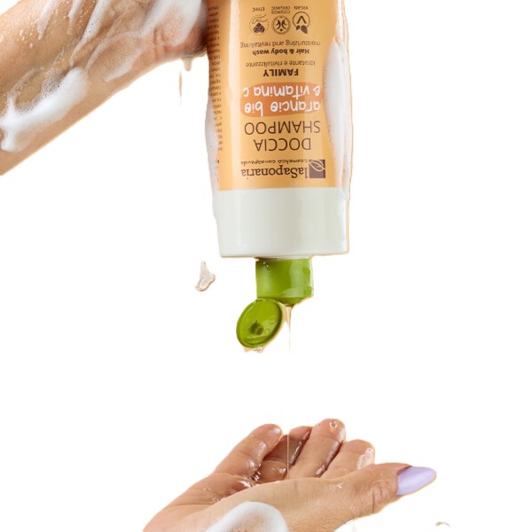 Basta una noce di Doccia Shampoo Biologico Arancio e Vitamina C per trasformare la doccia in un momento di energia e buonumore! Applicalo su corpo e capelli bagnati, massaggia con movimenti delicati fino a ottenere una morbida schiuma profumata, poi risciacqua con cura.