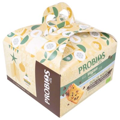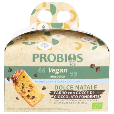*farina di GRANO FARRO 40%, *zucchero di canna, *gocce di cioccolato fondente 12% (*zucchero di canna, *pasta di cacao, *burro di cacao, aroma naturale di vaniglia), *olio di semi di girasole, *lievito naturale di pasta acida di GRANO 9% (*farina di GRANO tenero tipo 63% acqua), *sciroppo d'agave, *grasso vegetale (karitè), emulsionante:*lecitina di SOIA, *farina di piselli, *malto d'ORZO, sale marino, aromi naturali di agrumi (arancia, limoni), aroma naturale di vaniglia. *biologico.