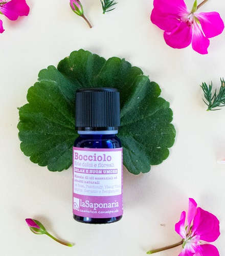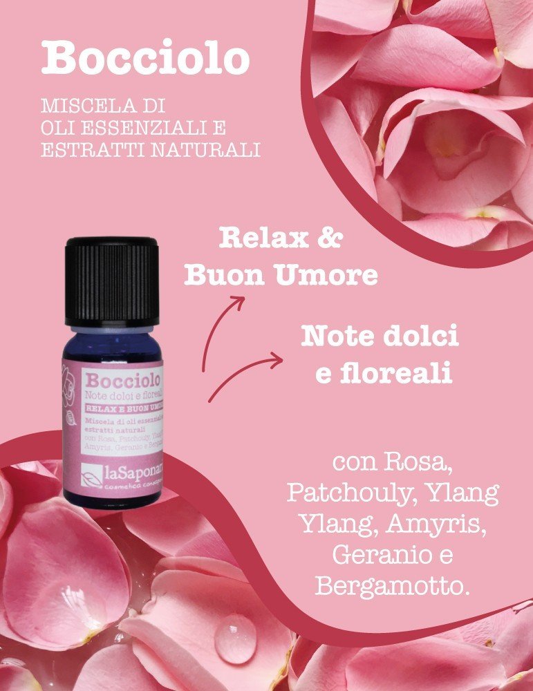 Bocciolo racchiude dentro di sé un profumatissimo bouquet floreale capace di sprigionare tutta l' energia di fiori appena sbocciati sotto il calore del sole. Agli oli essenziali di Rosa, Ylang Ylang e Geranio che costituiscono le note di cuore della miscela, si aggiungono le note di testa balsamiche dell' Amyris, e quelle agrumate del bergamotto che aggiungono brio ed energia. Il Patchouly di fondo evoca lontani paesaggi orientali rendendo la miscela intrigante e misteriosa. Un profumo sensuale capace di farci assaporare la gioia di camminare scalzi sull’erba di un giardino fiorito sognando il prossimo viaggio.