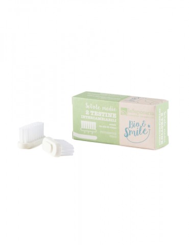 Dettagli super: Lo spazzolino in fibre vegetali Bio&Smile, realizzato in acetato di cellulosa 100% naturale e biodegradabile, ti permette di cambiare e sostituire solamente le setole del tuo spazzolino senza buttarlo, andando a ridurre del 92% i rifiuti nel nostro pianeta. Le setole di questa testina di ricambio sono fatte in olio di ricino, perfette per svolgere una delicata azione pulente su denti e gengive garantendo unigiene perfetta di tutta la tua bocca! Una scelta che farà bene ai tuoi denti, all'am