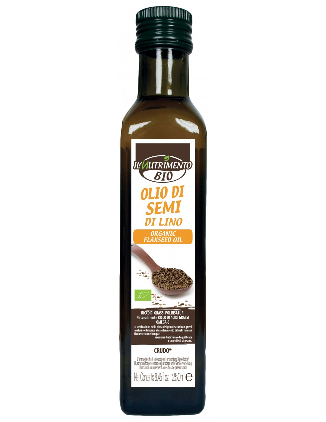 - L' olio di semi di lino biologico Il Nutrimento è ottenuto senza surriscaldare il seme né la pressa prima della pressione e senza aggiungere calore durante il procedimento di estrazione. È ricco di grassi polinsaturi e naturalmente e naturalmente ricco di acidi grassi omega-3. La sostituzione nella dieta dei grassi saturi con grassi insaturi contribuisce al mantenimento di livelli normali di colesterolo nel sangue. È rac