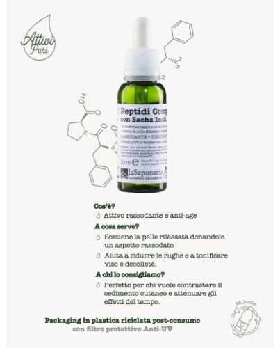 Peptidi Complex contiene un esapeptide (6 amminoacidi) di origine vegetale derivato da fermentazione e l’estratto – ricco in peptidi - di Sacha Inchi, una pianta perenne del Sud America, conosciuta e utilizzata per le sue straordinarie proprietà già dagli Inca. La combinazione di questi due ingredienti agisce in modo efficace e completo sul ringiovanimento del viso e del décolleté: migliorando il tono della pelle, contrastando il naturale cedimento cutaneo e combattendo i segni del tempo come rughe, perdita di elasticità e macchie. La pelle di viso e seno apparirà più uniforme, compatta e rassodata.