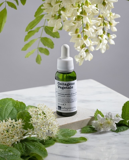 Il Collagene Vegetale fornisce alla pelle le proteine e il supporto di cui ha bisogno per contrastare i segni del tempo, idratandola e proteggendola dagli agenti esterni. Questo puro attivo naturale nasce dalla combinazione di due estratti ottenuti dal frutto di Kigelia Africana e dalla corteccia della Quillaja Saponaria, ricchi rispettivamente di peptidi e di flavonoidi e che, una volta entrati in sinergia, sprigionano le loro potenti azioni elasticizzanti, tonificanti e liftanti. Infatti, oltre a nutrire e riparare la pelle, questi preziosi attivi conferiscono un naturale effetto tensore immediato.