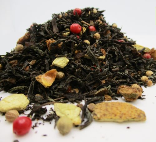 Ingredienti: tè nero*, mela, cannella, arancia, aroma naturale di mandorla, coriandolo, cardamomo, pepe rosa, o.e. di arancia, o.e. di cannella
